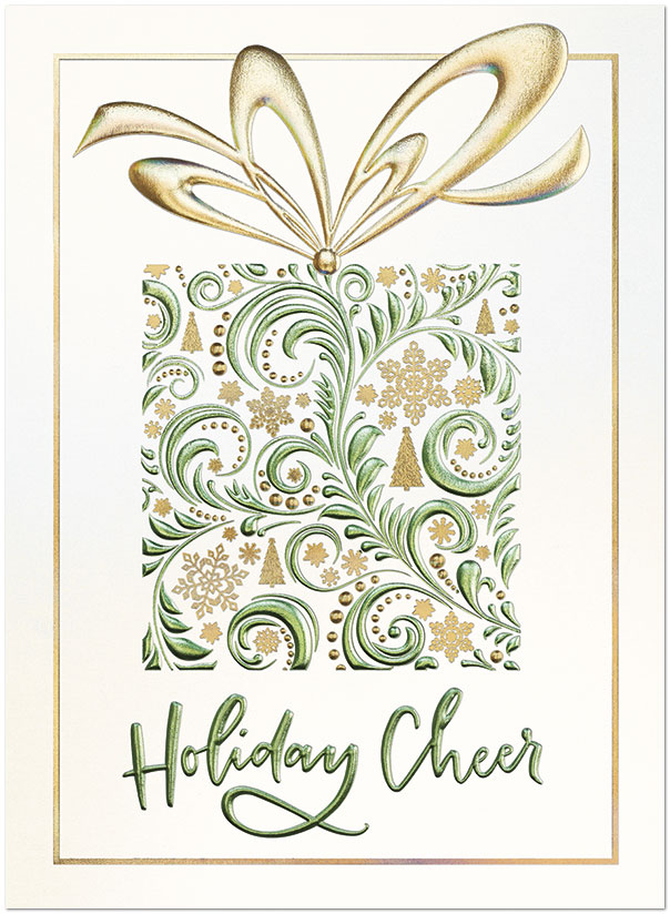 This elegant holiday card features a beautiful gift design with gold and green foil embossing on a shimmery metallic paper.