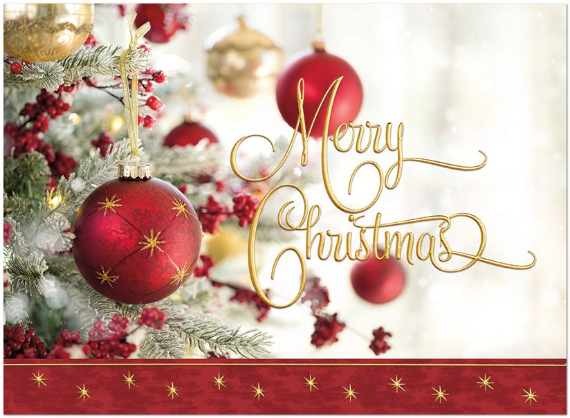 A classic Christmas card featuring a red and gold ornament design with gold foil embossing. Printed on matte FSC® paper.