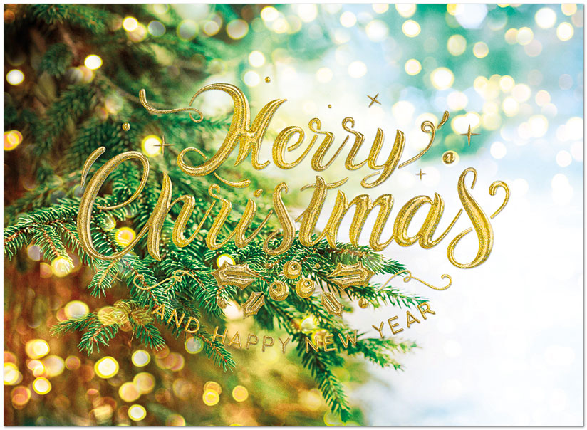 Send Christmas wishes to clients and employees with this Christmas tree design featuring gold foil embossing. Printed on satin FSC® paper.