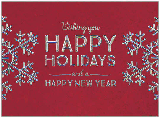 A classic business holiday card featuring snowflakes and silver holographic foil embossing. Printed on matte FSC®paper.