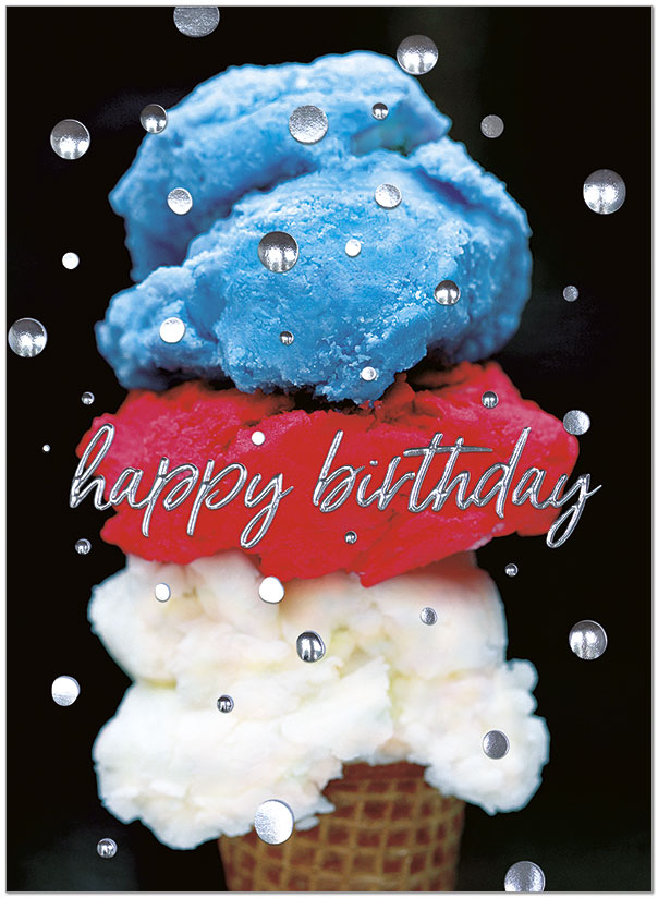 This birthday card features red, white, and blue ice cream with silver foil embossing. Printed on satin FSC® paper.