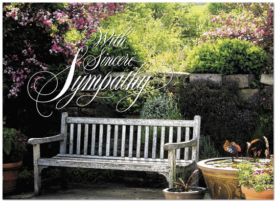 Beautiful flowers surround a park bench on this sincere sympathy card. Printed on FSC® certified paper.